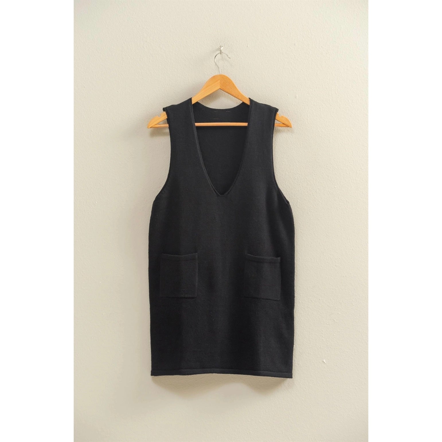 - This sleeveless knit mini dress features a deep V-neckline and a relaxed, easy-to-style silhouette. Designed with front pockets, it pairs effortlessly with fitted tops or turtlenecks for a layered look.